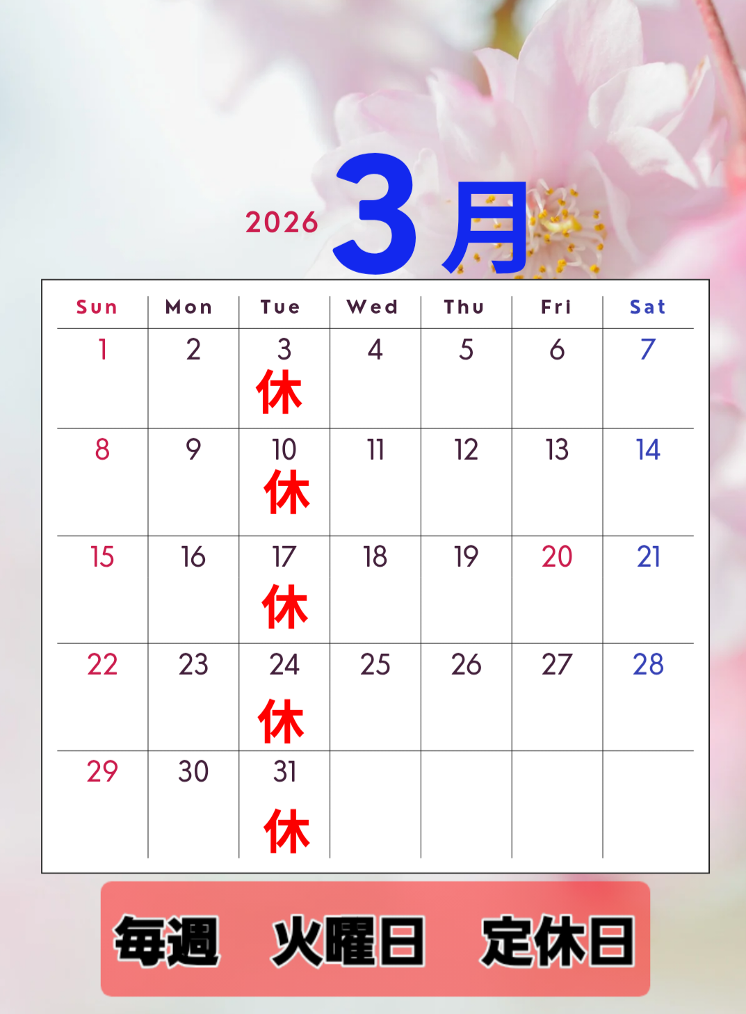 毎週 火曜日 定休日となります